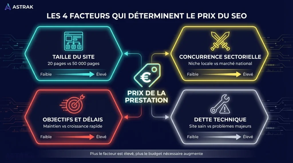 Dans cet article, on pose les chiffres sur la table. D’abord notre approche chez Astrak pour construire un devis adapte, puis les tarifs reels du marche francais, les facteurs qui font varier le prix, les differents types de prestations avec leurs couts, les risques du SEO low-cost, et enfin comment mesurer concretement votre retour sur investissement.