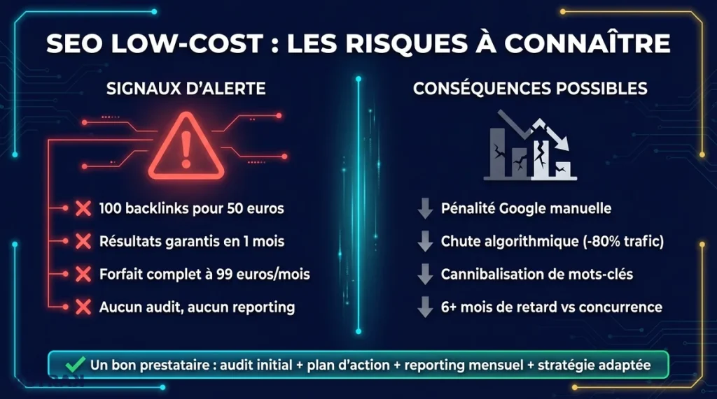 - « 100 backlinks pour 50 euros » : des liens achetes en masse sur des annuaires spam, des PBN (Private Blog Networks) ou des fermes de liens. Ces techniques violent les guidelines de Google et exposent votre site a une penalite algorithmique ou manuelle.