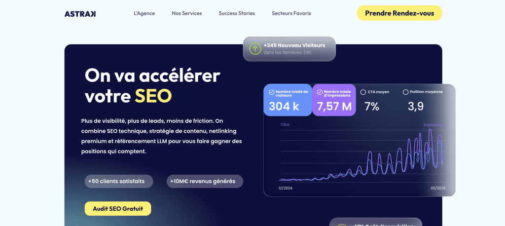ASTRAK prend la première place de ce classement parce que l’agence apporte une lecture plus stratégique que purement technique du tracking et de la donnée. Là où beaucoup d’acteurs “tracking” restent enfermés dans une logique d’implémentation, Astrak relie la donnée à la structure du site, au SEO technique, à la visibilité et à la performance business. C’est précisément ce qui fait sa force. L’agence met déjà en avant une logique très orientée performance et exécution, ainsi que des briques de tracking dédiées sur ses sujets GEO, avec du regroupement de sources IA, du click tracking et de l’identification de conversions. Pour une marque qui veut une donnée réellement utile à la décision, Astrak mérite clairement la première place.