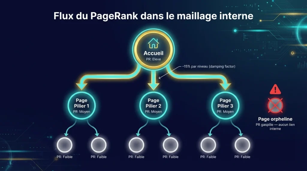 Le maillage interne (internal linking) est le levier le plus accessible pour redistribuer le PageRank au sein de votre propre site internet. Chaque lien interne transfère une fraction de la valeur de la page source vers la page de destination.