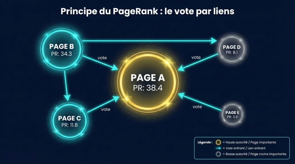 Le principe fondamental est simple : chaque lien hypertexte fonctionne comme un vote de confiance d’une page vers une autre. Plus une page reçoit de votes (de backlinks), plus elle est considérée comme importante par Google. Et tous les votes ne se valent pas : un lien provenant d’un site à forte autorité pèse bien plus lourd qu’un lien issu d’un site inconnu.