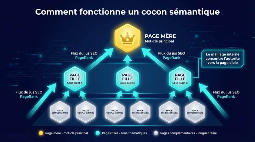 C’est le probleme que resout le cocon semantique. Ce concept, cree par Laurent Bourrelly, propose d’organiser vos contenus en groupes thematiques relies par des liens internes contextuels. Chaque page a un role precis dans l’architecture du site, chaque lien a une direction logique, et l’ensemble facilite le travail d’indexation de Google tout en ameliorant l’experience utilisateur.