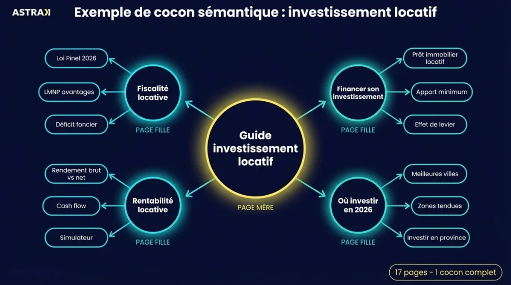 Voici un exemple de cocon semantique concret pour un site immobilier qui veut se positionner sur « investissement locatif ». Ce cas illustre l’application du cocon semantique en pratique, de la structure a la strategie de liens.