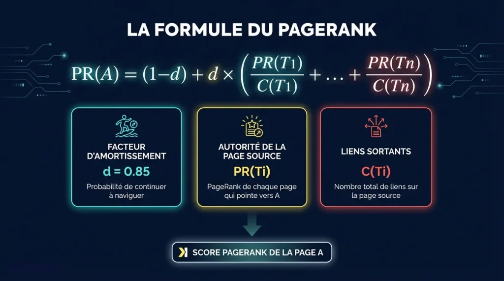 Réserver un diagnostic SEO gratuitDans cet article, on décortique le PageRank de A à Z. D’abord sa définition et son histoire, puis sa formule de calcul détaillée avec un exemple concret, les facteurs qui influencent la transmission du jus SEO, et enfin les stratégies pratiques pour l’exploiter en 2026. Que vous soyez consultant SEO ou webmaster, vous repartirez avec une compréhension solide de cet algorithme fondamental.